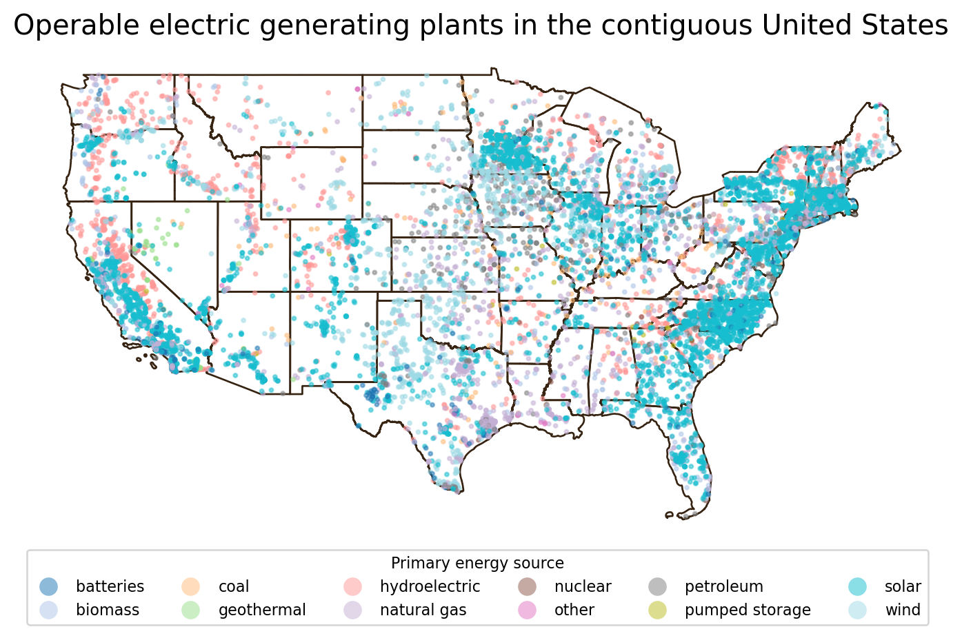 In this lesson, we will use data from the U.S. Energy Information Administration (EIA) about operable electric generating plants in the United States by energy source, as of May 2023. The dataset includes information on plant types and energy sources, offering insights into the diversity of power sources—from fossil fuels to renewables—that supply electricity nationwide. The dataset’s metadata can be accessed here The EIA data on electric plants has been downloaded as a CSV and reprojected into the EPSG:4269 CRS for this lesson. It can be accessed here.