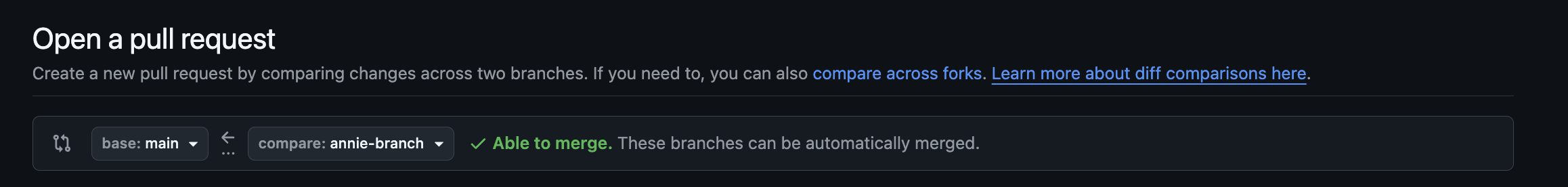 - Github will compare your branch with main and make sure there are no conflicts. If there are no conflicts, a “Merge pull request” option will appear. Click on this!