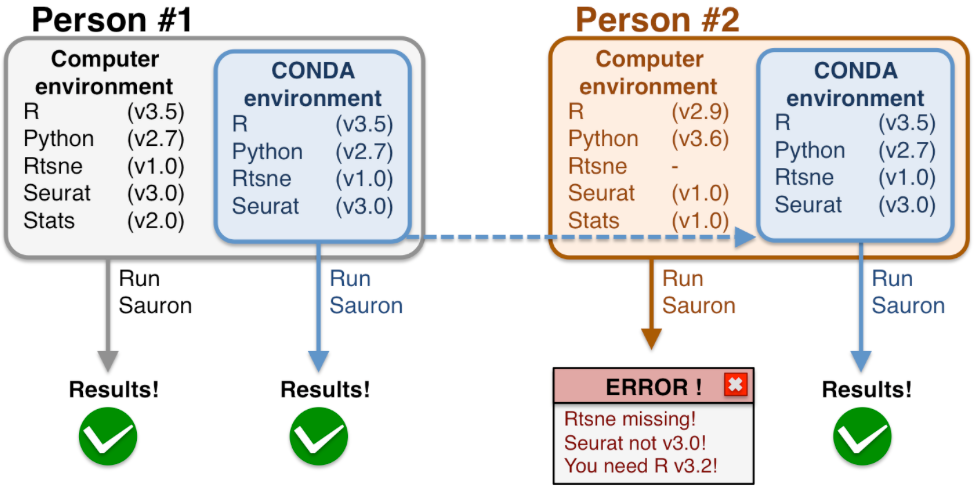 It can both create and administer the environments and install compatible versions of software and their dependencies.